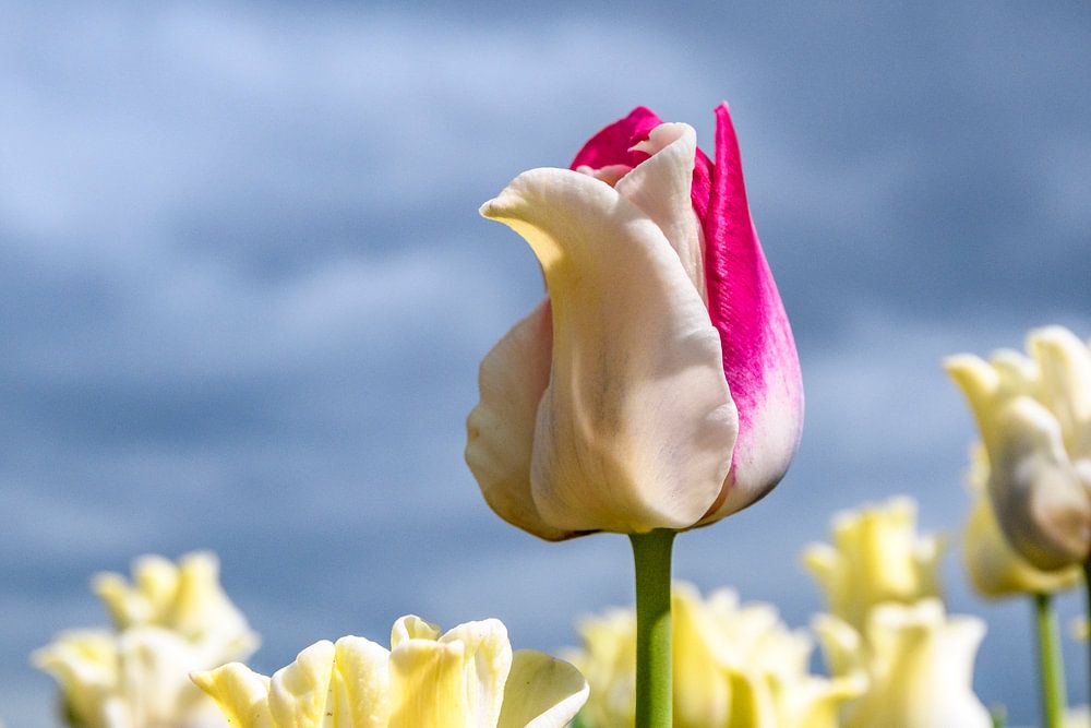 About "Field of blossoming white tulips and one pink tulip during springtime"