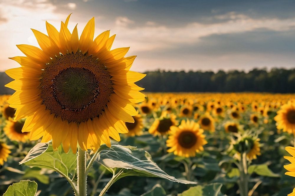 This beautiful photograph shows a field of sunflowers bathed in the warm light of the setting sun. The vibrant yellow flowers contrast sharply with the deep green leaves, creating an impressive display of colour and nature. Perfect for adding a touch of natural beauty and serenity to any interior, this image brings a sense of calm and joy. It is an ideal decoration piece for a dining room or bedroom, where it will leave a lasting impression and light up the atmosphere with its sunny look and vibrant colours. Let these sunflowers light up your space and put a smile on your face every time you look at it.
