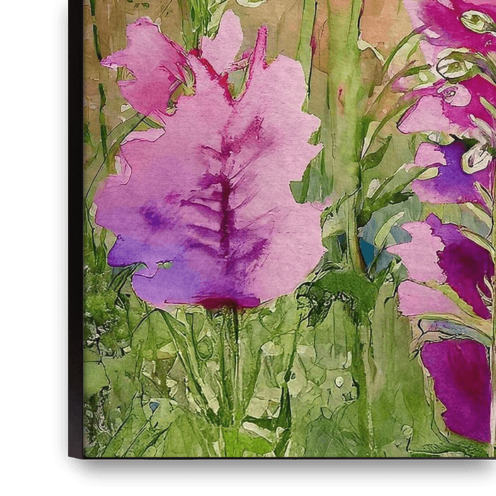 Buy this flower art Field with colourful hollyhocks and poppies, series: Botanical abstract by Studio Pieternel on canvas, ArtFrame, poster and wallpaper, printed on demand in high quality.
