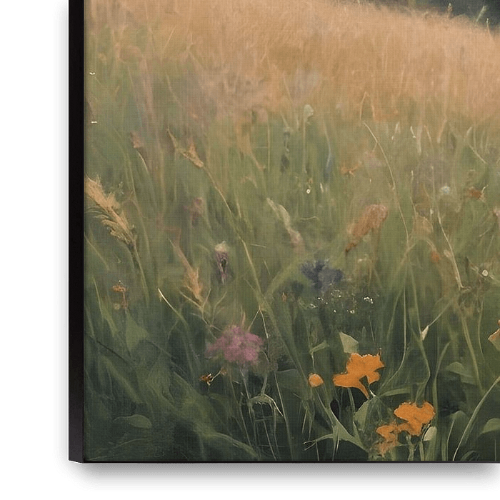 A painting of a serene landscape bathed in the warm glow of a setting sun, illuminating rolling hills, a field of golden grasses, and scattered wildflowers