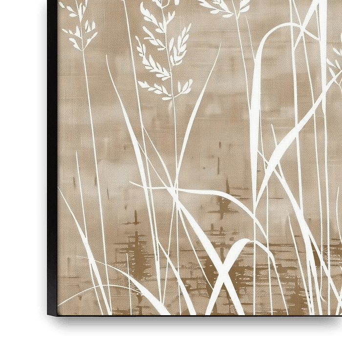 Fields of Serenity - This nature painting shows a series of delicate and graceful grasses and grasses, rendered in a stylish simple white on a monochromatic light brown background. The grasses, including various types such as wheat and other field grasses, are finely and artistically rendered, contributing to a sense of serenity and…