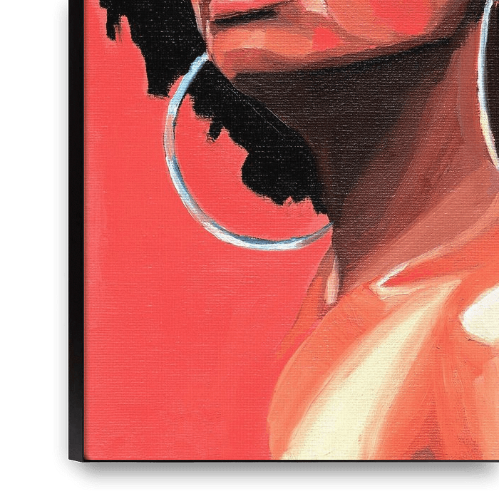 Print from an original oil painting that celebrates strength, beauty, and vibrant expression. This compelling figurative portrait features a woman with a magnificent hairstyle and elegant hoop earrings, set against a powerful crimson red background.