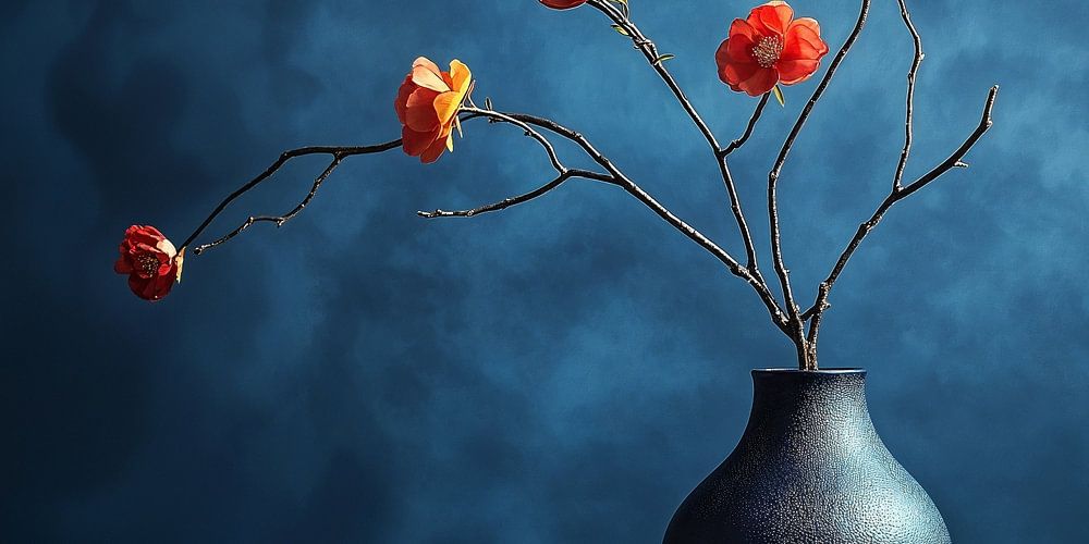 This work of art evokes a deep sense of contemplation and hope. The vibrant red blossoms, which stand out like fiery points of light against the mysterious, dark blue background, symbolize resilience and vibrancy in the midst of challenging circumstances. In the context of loneliness and introspection, the image offers comfort and inspiration. The minimalist composition invites reflection on the power of subtle beauty and the possibility of growth, even in seemingly barren environments. The work evokes emotions of melancholy mixed with a sense of quiet determination, leading to a deep sense of inner strength and appreciation for life's unexpected moments of beauty.