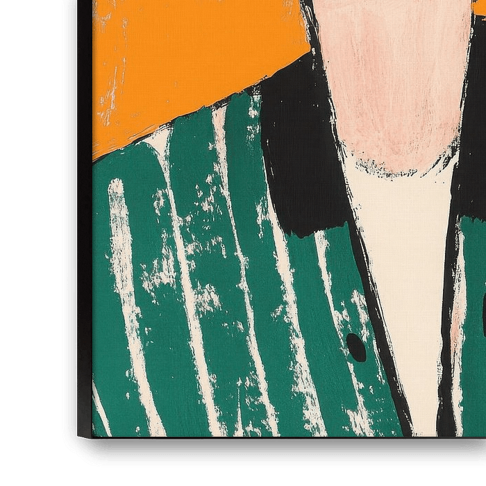 This stylised illustration shows a person with short, dark hair and closed eyes. The cheeks are accentuated in pink, while a green jacket with white vertical stripes and a black collar characterises the outfit. A white undershirt is visible at the neckline. The bright orange background forms a strong contrast to the figure and creates a striking effect. The minimalist, graphic design uses clear contours, flat colour fields and visible brushstrokes, especially in the background. The neutral facial expressions and centred composition create calm and balance, with the colours drawing the main attention to the figure.