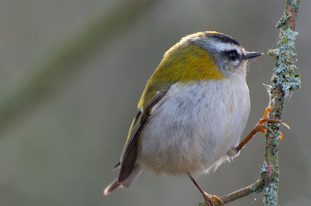 Fire goldcrest in a forest in the Molsbroek nature reserve in Lokeren (Belgium). Sitting on twig, among the cobwebs.