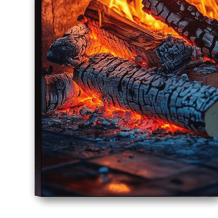 A blazing fire dances in vivid shades of orange and yellow, while glowing logs flash with an inviting warmth. The rising flames seem to whisper stories from times gone by, while the crackling of the wood creates a cosy atmosphere. An interplay of light and shadow that promises cosiness and security.