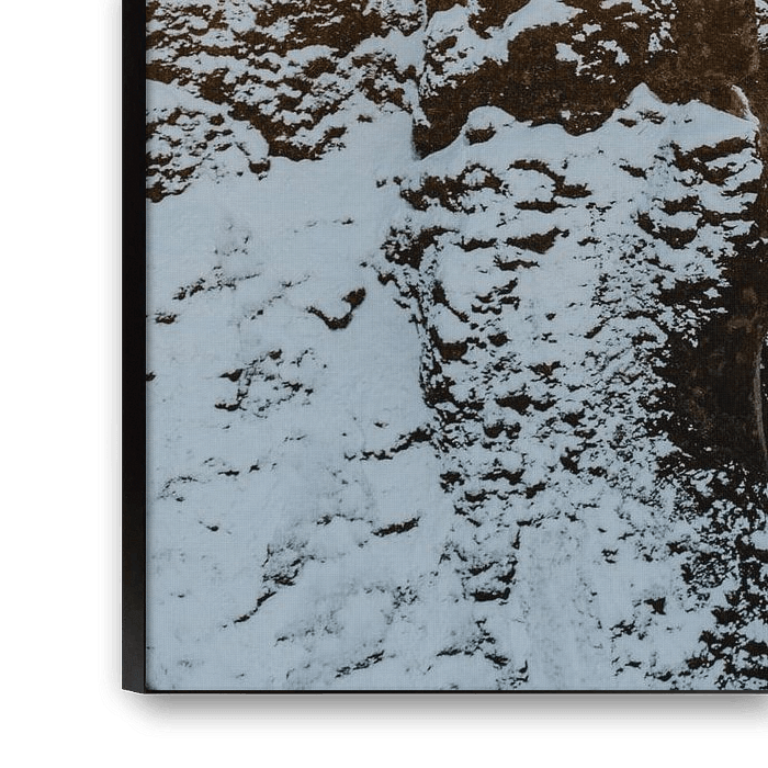 Fjaðrárgljúfur canyon covered in snow in Iceland. river Fjaðrá river runs through it. Spot the two people in the upper left corner for some perspective.
