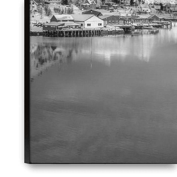 Buy this landscape artwork Fjord landscape in Norway with mountains in black and white. by Manfred Voss, Black-White Photography on canvas, ArtFrame, poster and wallpaper, printed on demand in high quality.