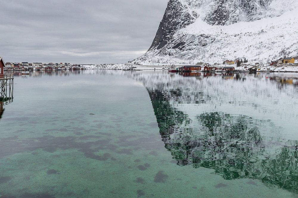 Fjord on the Lofoten(Norway) in winter with no wind and reflection.