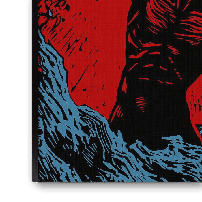 powerful figure rises from turbulent blue waves, reaching toward a blazing orb as yellow flames erupt from their back against a red sky.