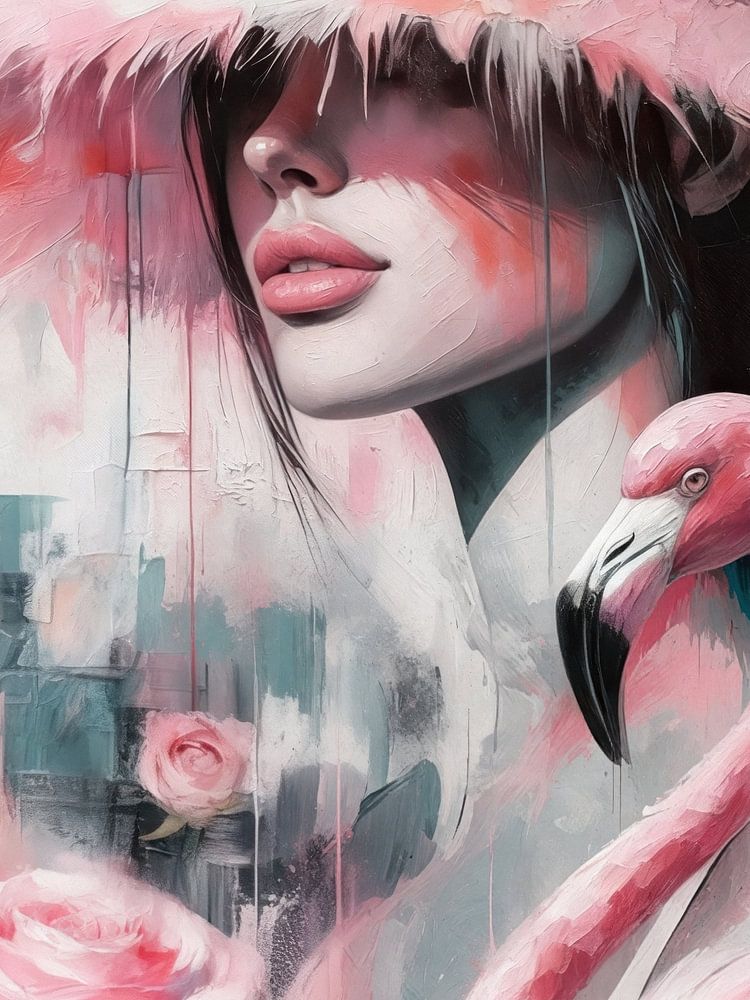 A contemporary portrait in pink: the mysterious figure with hat merges with floral accents and a majestic flamingo. The harmonious colour palette makes this work of art a stylish eye-catcher for modern living spaces.