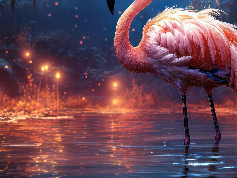This artwork brings the dreamy atmosphere to life with flamingo's standing elegantly in the water, surrounded by brilliant orange sparks. The combination of orange, pink and blue evokes a feeling of carefree summer days. This artwork fits perfectly in an interior with a summery, tropical or vibrant look. The orange sparks add a touch of warmth and passion to the space and bring out the beauty of exotic birds.