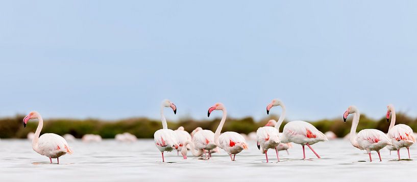 Pink flamingos (Phoenicopterus roseus) in the shallow water of a lagoon in the Camargue, France.