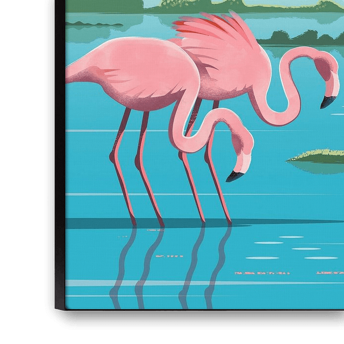 My illustration shows the colourful flamingos at Pekelmeer in Bonaire. This area is a natural saltwater lagoon, where flamingos wade through the water, their vibrant pink plumage contrasting beautifully with the white salt flats in the background.
