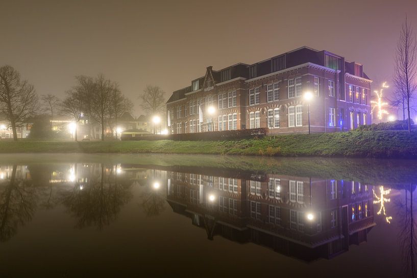 Flevogebouw old school building in Zwolle during a foggy winter night with street lights reflected in the canal in the foreground.