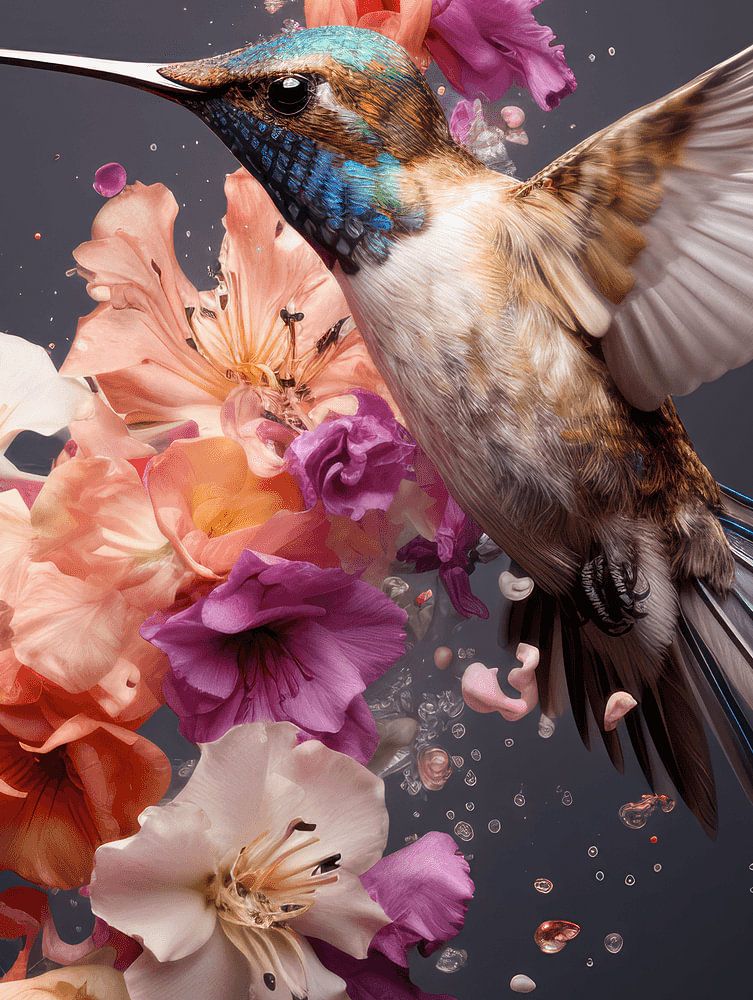 "Flight of Refinement" is an ethereal depiction of a hummingbird in full flight, surrounded by a cascade of delicate flowers. The fine details of the feathers and subtle colour transitions create a sense of movement and lightness. The flowers, ranging from soft pastels to vibrant coral tones, almost seem to dance in the air around the bird, adding a sense of weightlessness and transience. An ode to natural elegance, this artwork would add a serene and sophisticated touch to any interior.