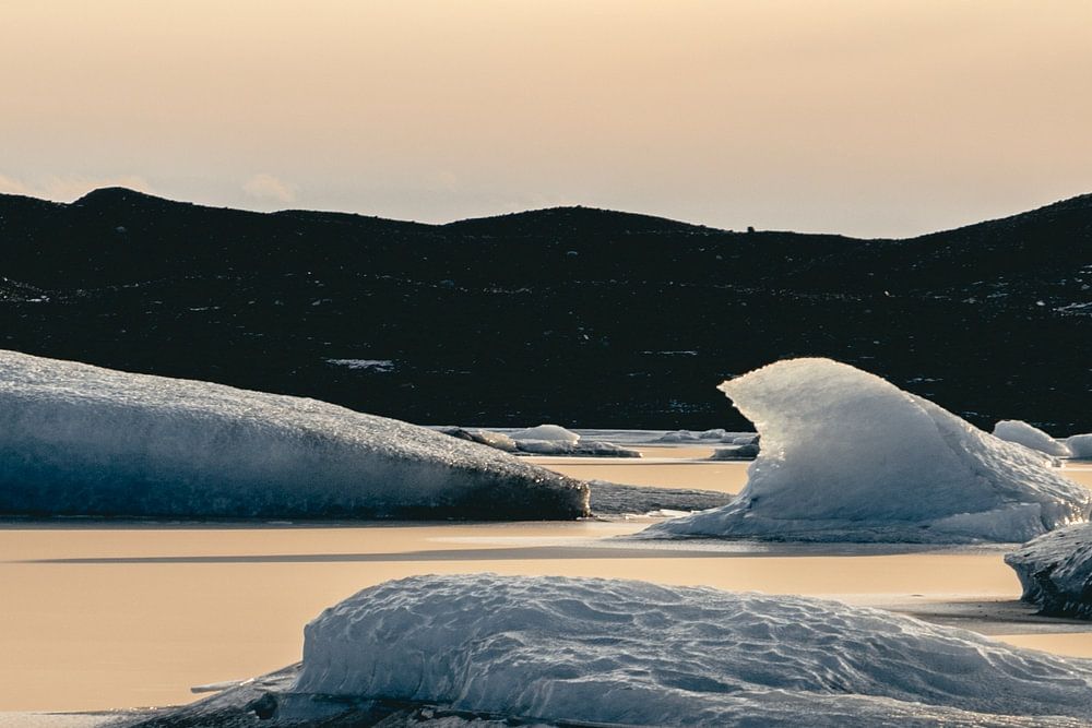 In Iceland there are several lakes in which ice floes slowly towards the sea. This picture was taken at Fjallsárlón, which is close to the bigger Jökulsárlón. The yellow-orange light creates a beautiful warm glow, even though it was very cold there!