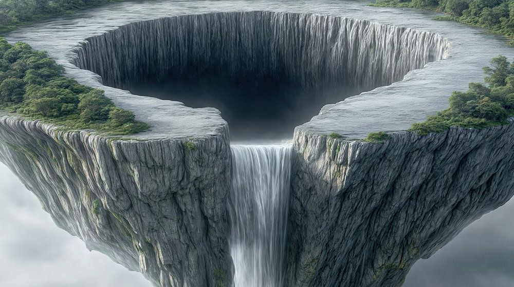 High above an endless sea of clouds hovers a gigantic island with an impressive circular hole at its centre. Surrounded by dense forests and green treetops, a mighty waterfall plunges into the depths, seemingly disappearing into nothingness. The walls of the island drop away steeply, as if they lead to infinity, and yet the scene appears calm and peaceful, as if nature exists in a harmonious balance with the heavens.