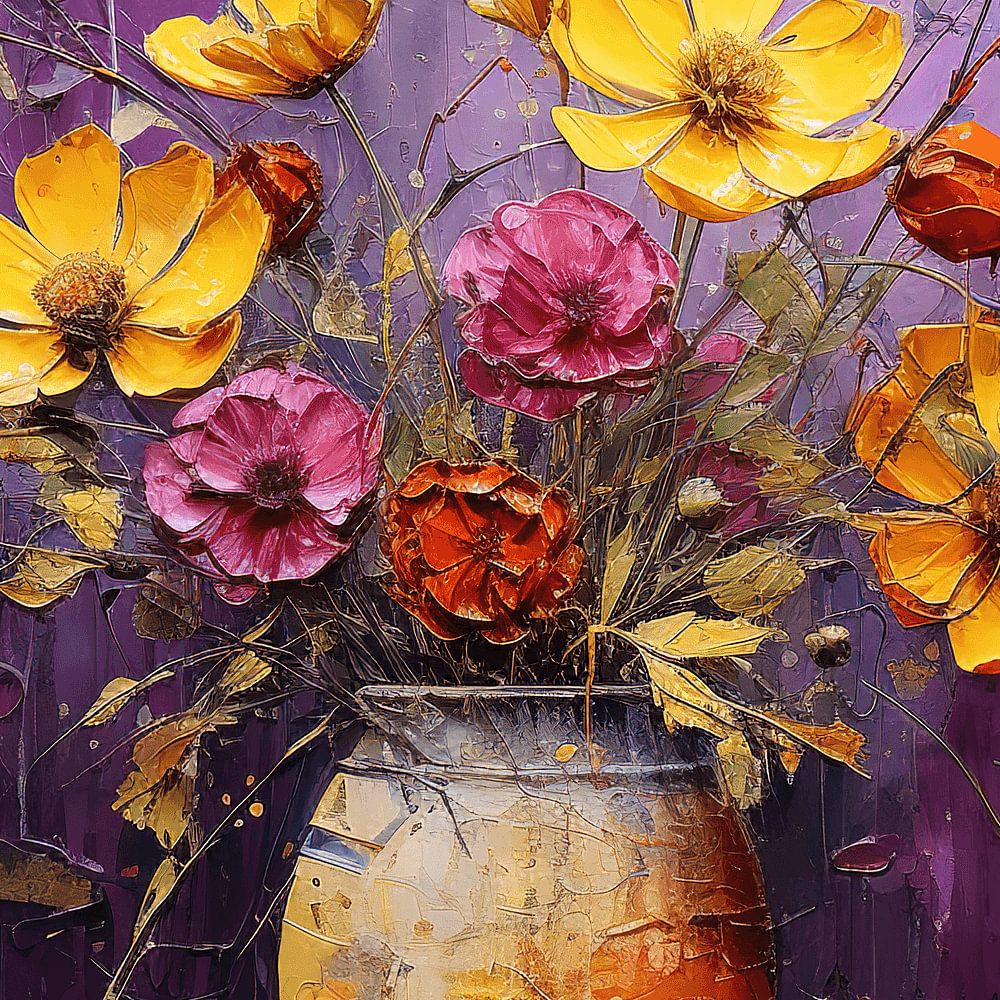 This captivating painting from 'Blossoms in Bloom' portrays a harmonious blend of colorful flowers in full bloom. The artist skillfully captures the delicate dance of petals, creating a visual symphony of nature's beauty.