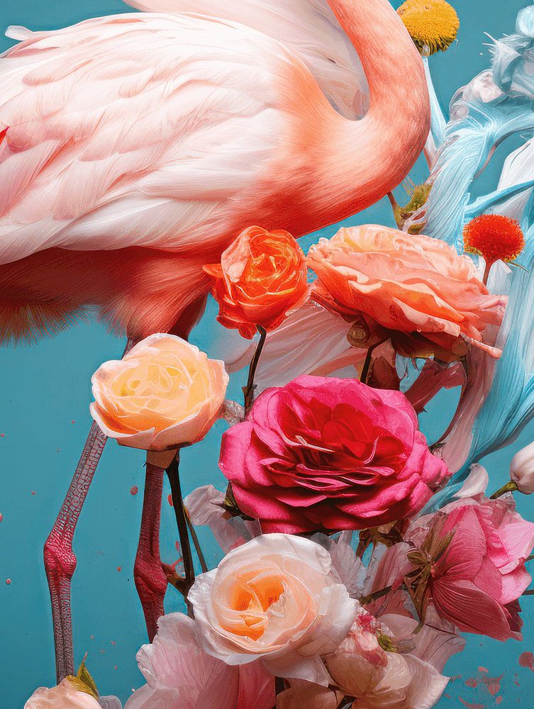 "Floral Flamingo Fantasia" is a stunning fusion of flora and fauna, a picture-perfect ballet of flowers in which a graceful flamingo is the star. Vibrant with pink hues and an aquamarine background, the artwork brings to life the gaiety of a blooming garden, with the flamingo as the graceful conductor of this natural symphony. The dynamic water and flower elements seem to float around the bird, creating a dreamlike atmosphere. This piece would be a wonderful visual accent in a contemporary interior, where it adds a refreshing and artistic flair.