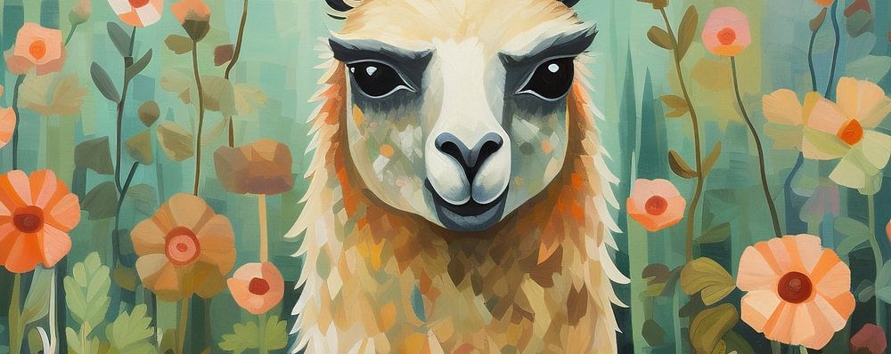 Floral Lama - This painting shows a charming llama amidst a blooming field of flowers, painted with a playful approach reminiscent of a modern illustrative style. The varied shades of green and orange create a vibrant, yet soothing image, while the llama's expressive gaze immediately grabs your attention.