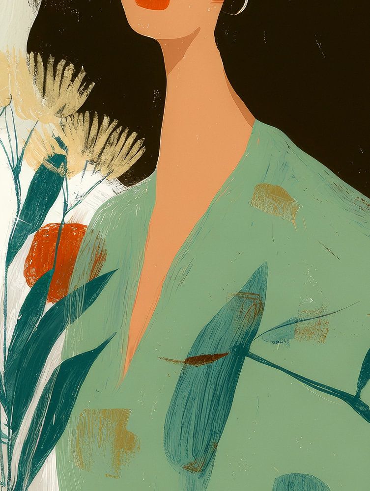 In this stylish digital illustration, simplicity meets expression. The woman with wavy hair and penetrating gaze holds flowers, symbolising softness and growth, while her posture exudes strength and calm. Inspired by minimalist painting and botanical elegance.