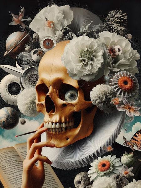 A detailed skull portrait adorned with blooming flowers and soft botanical elements. The composition blends mortality symbolism with delicate natural beauty, creating a balanced contrast between life and decay. Soft lighting and painterly textures give this artwork a refined, contemporary, surreal feel suitable for modern interiors and…