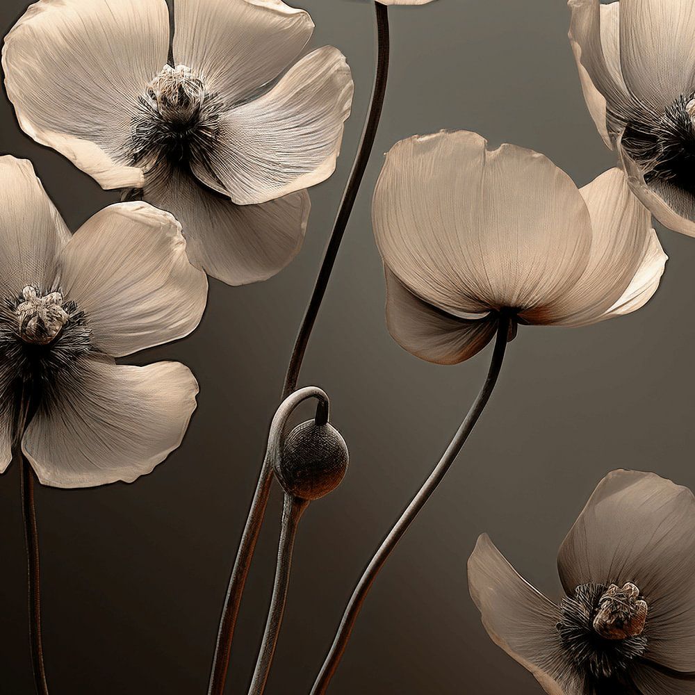 A bold composition of flowers unfolds in monochrome contrast, where shadow and light create a dance of abstract art. The flowers seem to float like silhouettes in a dramatic choreography, their shapes and contours emphasising the beauty of the simple and the powerful.