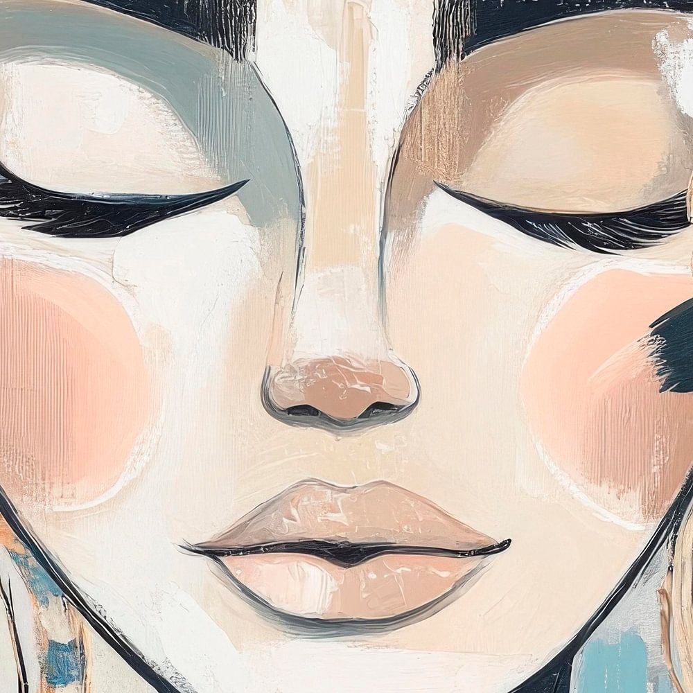 With a gentle smile and closed eyes, the elegant figure radiates calm and grace. Framed by floral accents and tasteful earrings, she conveys a harmonious impression. The delicate colours and expressive face convey a message of inner strength and natural beauty that captivates the viewer.