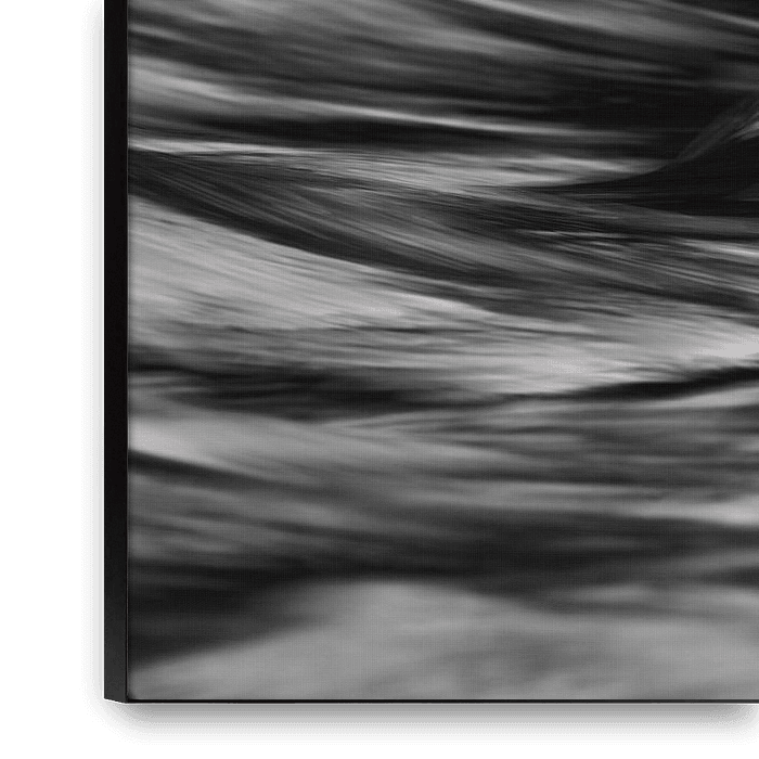 Detailed view of the flowing water of a small river, high-contrast black and white image, flow structure, long time exposure, narrow focus zone