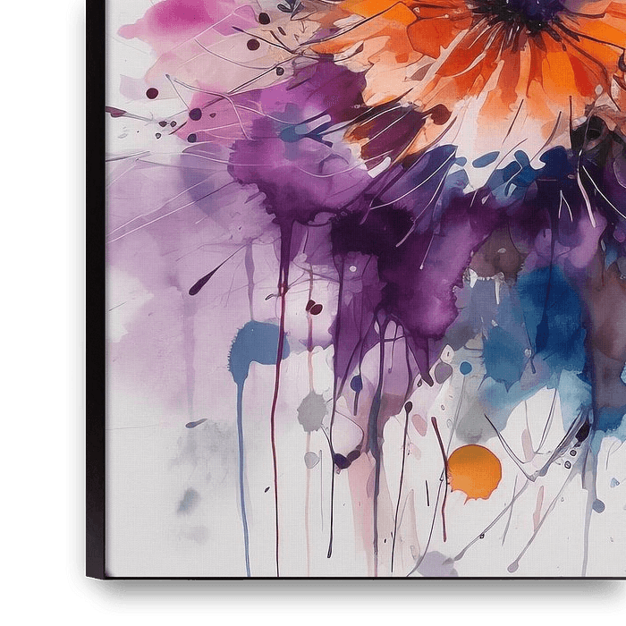 This abstract painting shows an explosive composition of flowers in bright, vibrant colours. Orange, pink, purple, blue and green literally splash off the canvas, as if the flowers were bursting apart in full bloom. There is no tight contour-the shapes are made up of brushstrokes, splashes and drops that form a dynamic and energetic…
