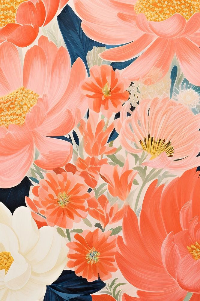 Flower Garden Art - The painting shows a vibrant garden full of large flowers, executed in a warm and inviting colour palette with predominant Peach Fuzz tones. The whole looks meticulous and detailed with a touch of playfulness in the flower shapes and the subtle presence of fauna.