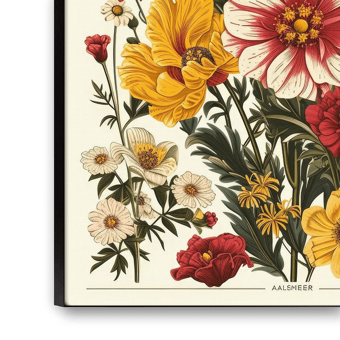 This trendy artwork is a vintage-style poster titled 'Flower Market Aalsmeer' a tribute to one of the largest flower markets in the world, located in the Netherlands. The illustration is richly filled with a variety of flowers in warm and inviting colours. At the centre are large, striking flowers such as a deep red zinnia and a yellow sunflower that draw immediate attention with their full bloom and detailed rendering.