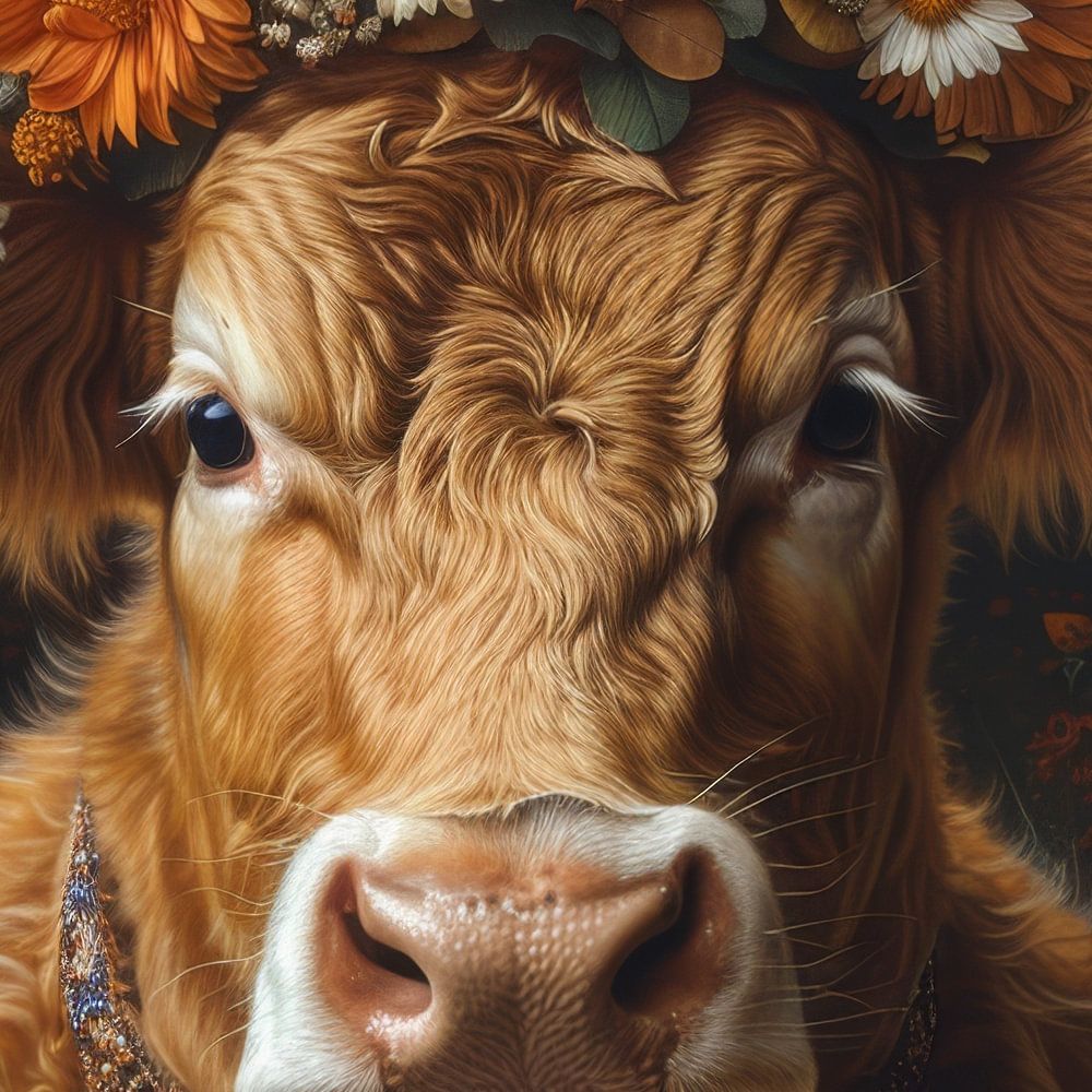 This exquisite portrait of a Highland cow, crowned with a vibrant wreath of wildflowers, exudes a calming warmth that will enhance any home. The carefully selected orange tones of the flowers, nestled in the billowing sea of wildflowers, contrast harmoniously with the soft brown of the coat and the animal's sensitively captured, expressive eyes. The artist has succeeded in evoking a sense of connection with nature through the detailed depiction and the mysterious dark background. This work of art is particularly appealing to lovers of rural idylls and lends any room an atmosphere of peaceful country life.