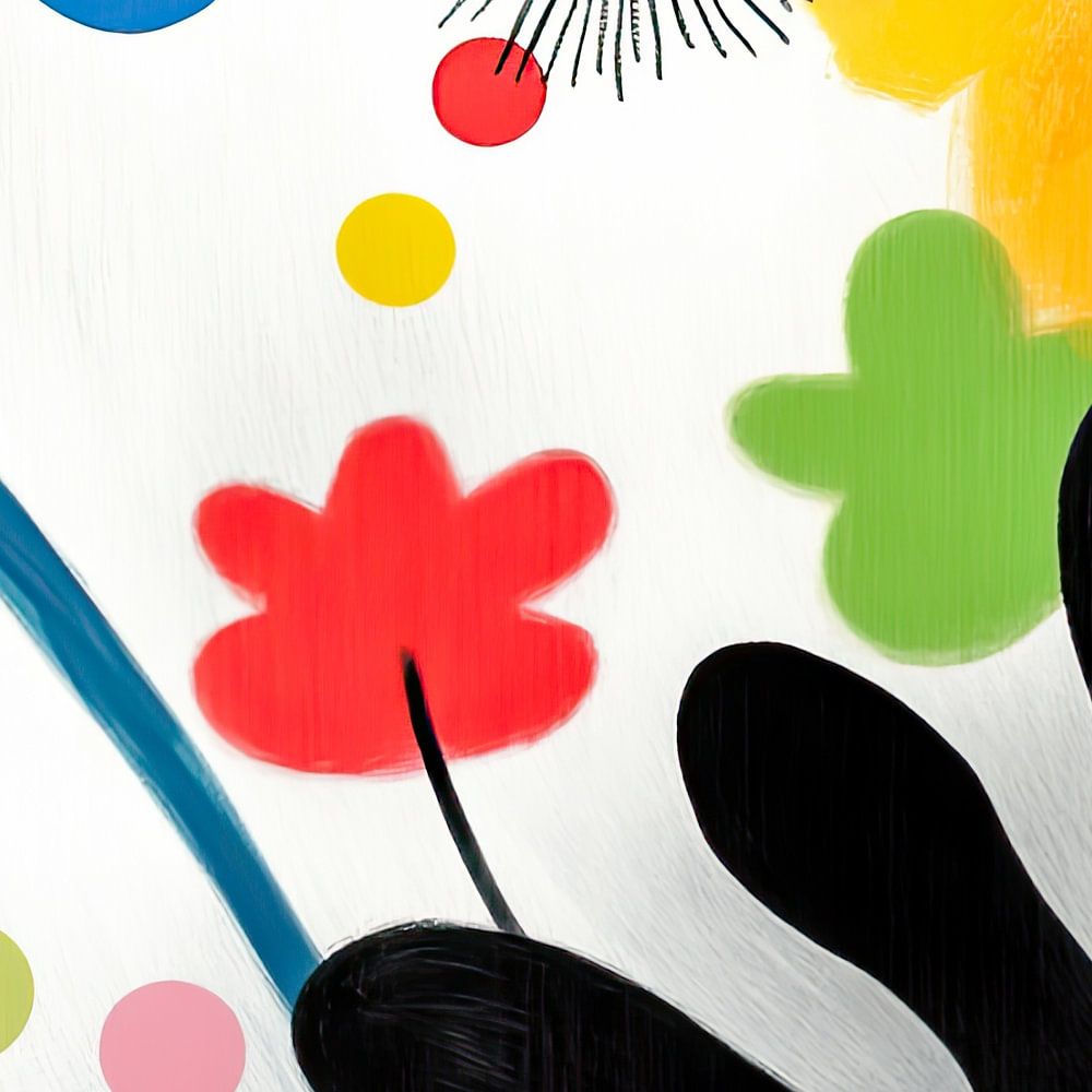 This painting combines dynamic shapes and bright colours that reflect the vibrancy of flowers and the lightness of nature. The abstract floral motifs and organic shapes lend a playful touch and invite you to dream. With a harmonious interplay of vibrant red tones, sunny yellow and calming blue, this picture is an absolute eye-catcher in any modern home. Ideal for living rooms, offices or creative spaces.