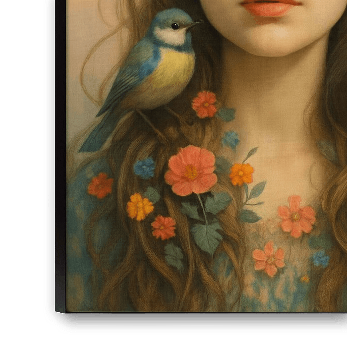 Buy this portrait Flower girl with birds - dreamy spring in portrait form by But First Framing on canvas, ArtFrame, poster and wallpaper, printed on demand in high quality.