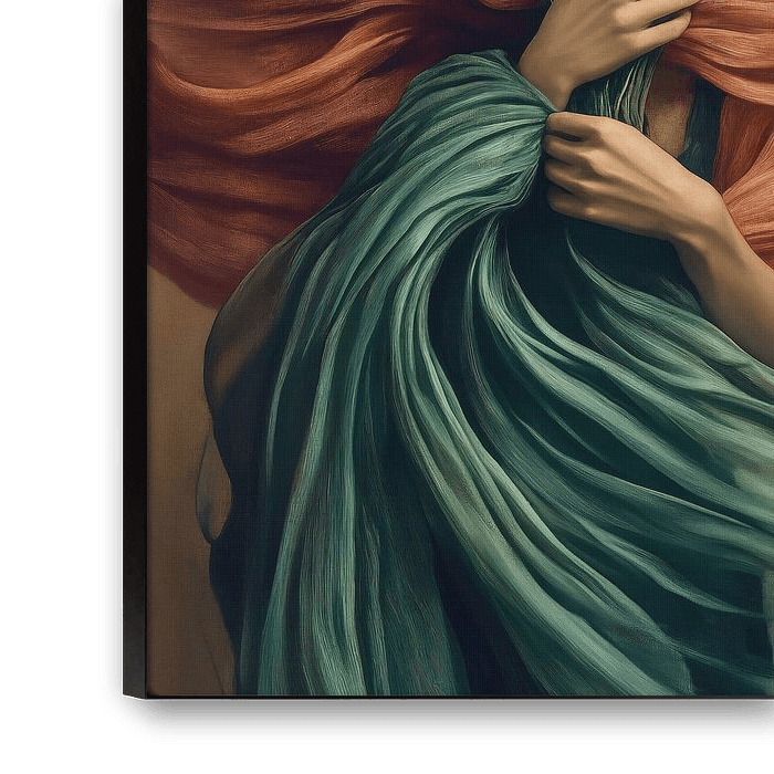 A surreal portrait in which delicate hands hold a bouquet of white roses, surrounded by swirling fabrics in warm brown tones and cool green tones. The figure remains hidden, while the dynamic composition evokes a sense of movement and transformation, blurring the boundaries between man and nature in an elegant dance of colors and textures.