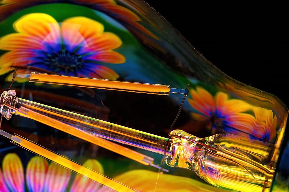 The photo of a Bornholm daisy and a light bulb, which instead of a glowing filament reflects an image of the flower several times in itself, plays lightly with light and colors.
