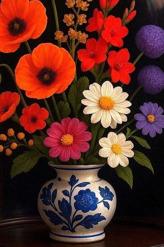 A burst of colour and vitality - orange poppies, red carnations and purple accents dance together in a Delft vase. This composition captures the warmth of a summer day in a timeless still life full of energy.