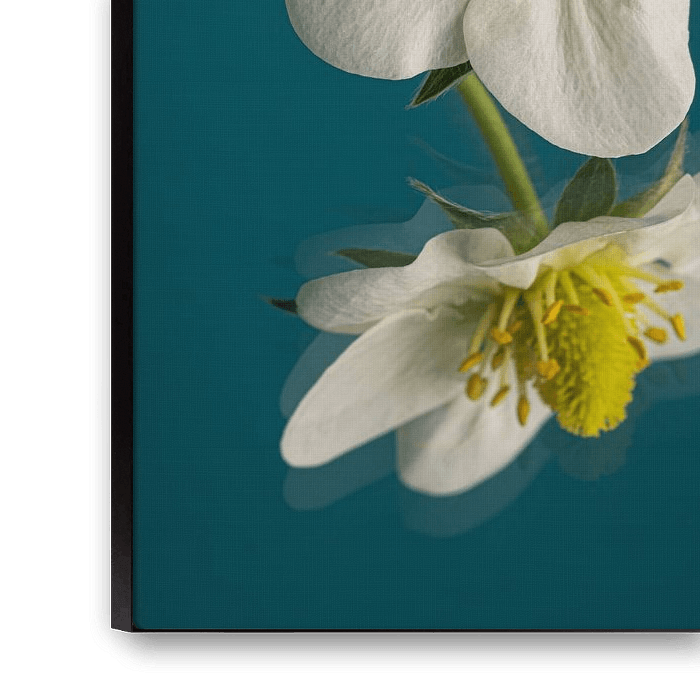 "Flower of a strawberry plant" is a macro photo of a small white flower of the strawberry plant. This little flower lies on a mirrored surface, so you can see the mirror image of the flower in the ground. This gives a funny effect. The back and background are turquoise / teal / petrol in colour.