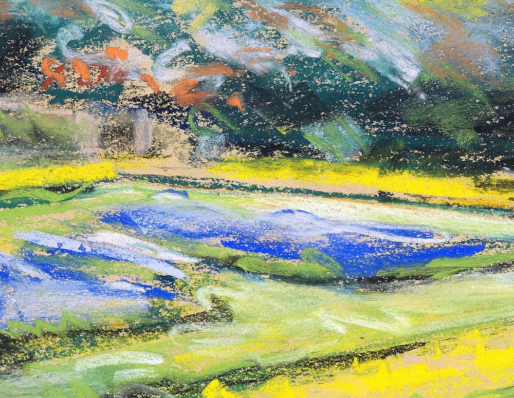 Here you can see a landscape, a pond surrounded by trees and flowers in yellow and green.