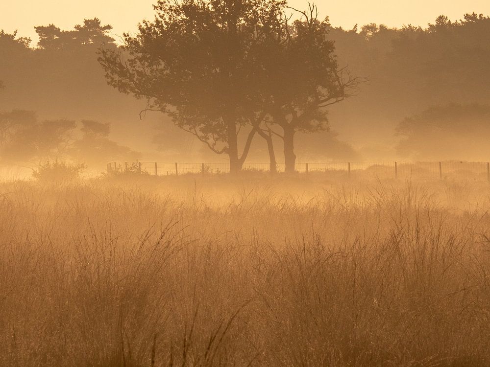 Flowering heather with early morning mist. Golden hour colours and a few trees in the field.