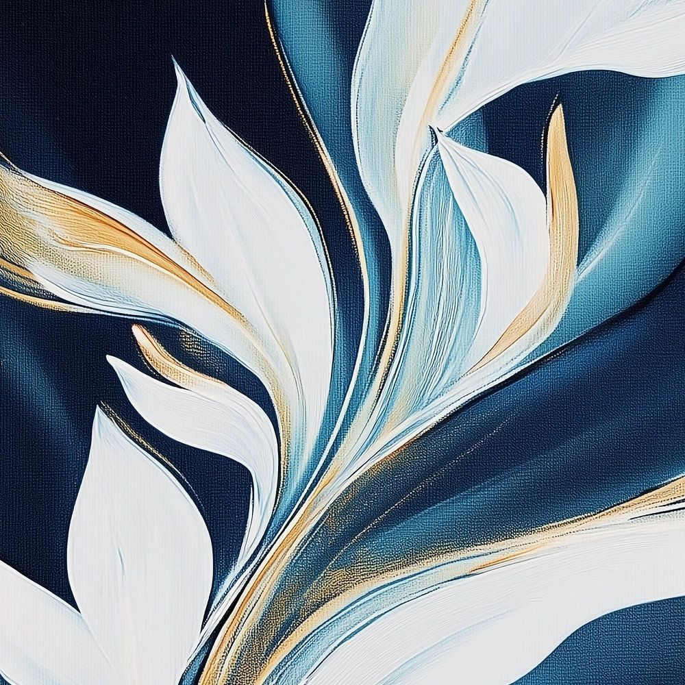 This work exudes a poetic elegance, combining fluid abstraction with references to nature. Against a deep, night-blue background, shapes reminiscent of leaves or petals unfold. The brushstrokes are elongated and graceful, executed in white and soft golden yellow accents, which give the whole a glossy and almost ethereal look. The blue acts as a frame that lets the light shapes shine, as if they contain a light source of their own.