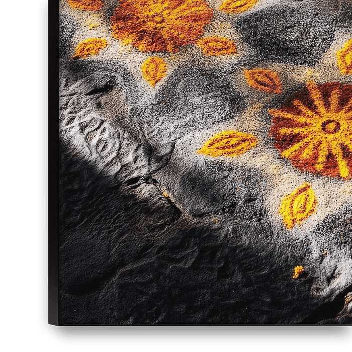Vibrant floral patterns dance on the stone floor, captured in a gentle interplay of light and shadow. The warm yellow tones radiate an inviting energy that brightens up any room. Ideal for the kitchen, where creativity and enjoyment are at home, this picture brings joy and life to everyday life.