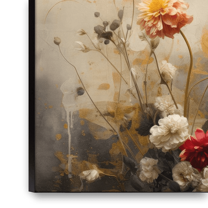 Flowers against an abstract background in wabi-sabi style. A special eye-catcher for your interior that keeps you looking. Choose your own size and material for this work.