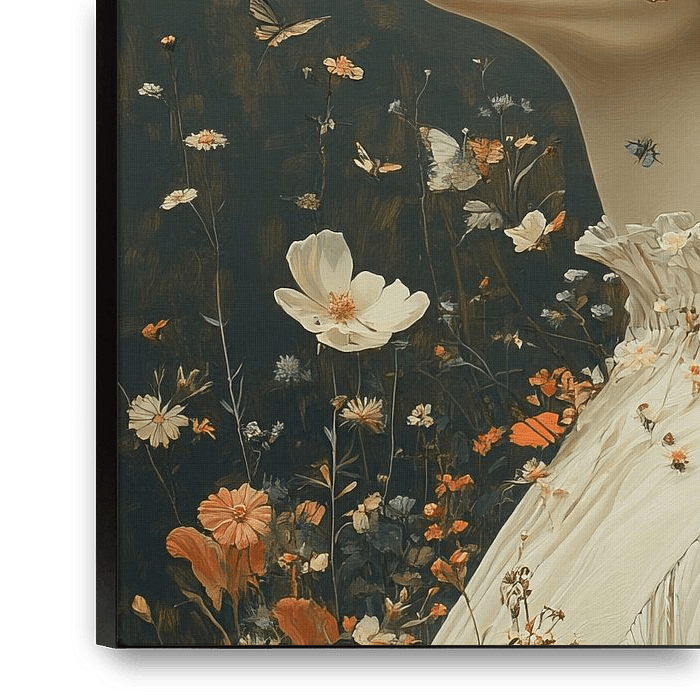 Flowers and Butterflies - This floral painting shows a woman surrounded by a wealth of flowers and butterflies, with details and colours blending harmoniously.