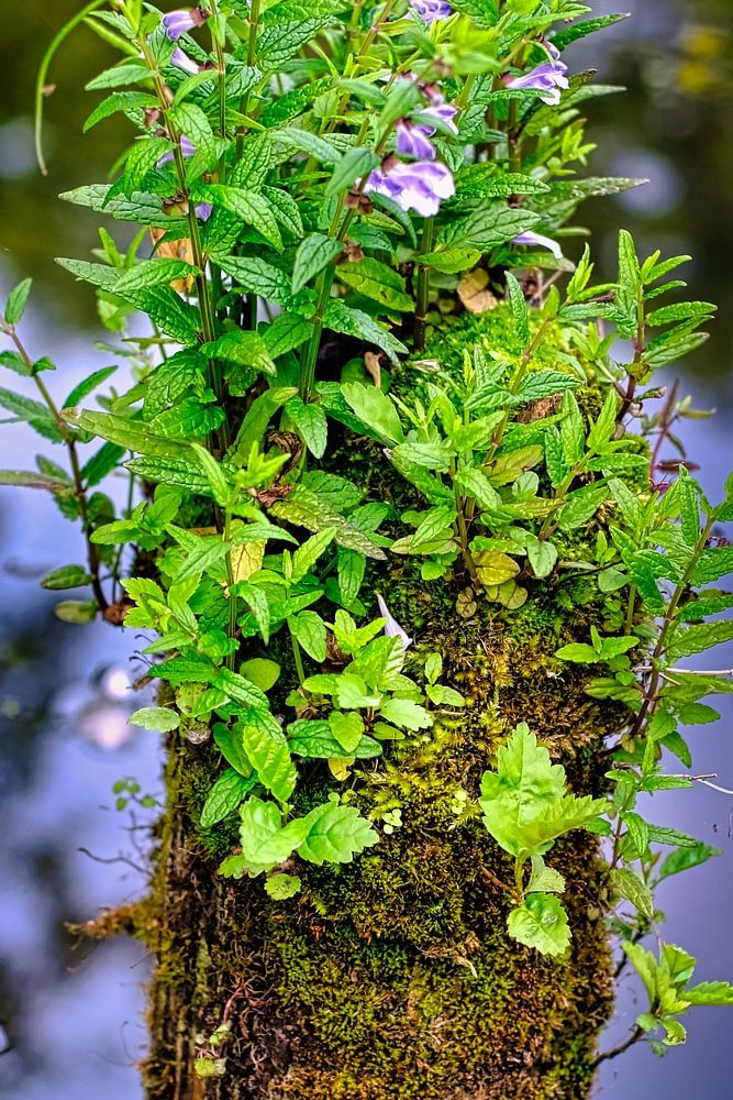 About "Flowers and plants on mossy picket in pond surrounded by water"