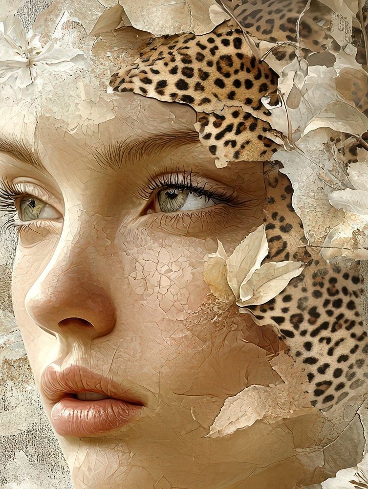 A unique portrait of a woman surrounded by delicate flowers and striking leopard details. The warm beige tones and natural textures create a mystical and artistic look. Perfect for a modern interior that combines elegance and a touch of adventure.