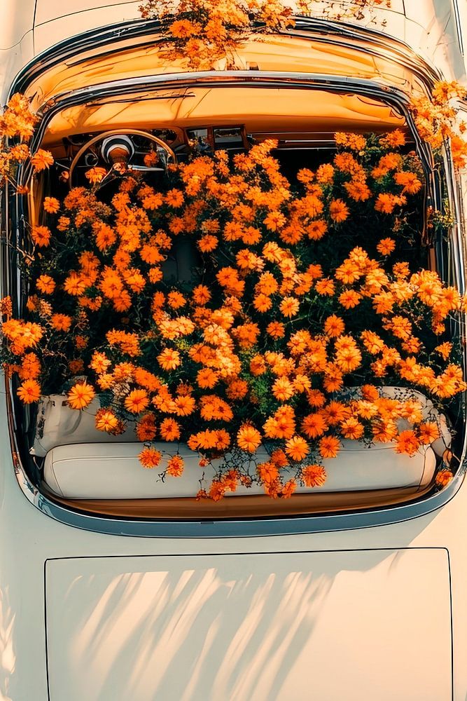 A nostalgic vintage car, gently enveloped by vibrant, orange-coloured flowers, evokes a feeling of freedom and joie de vivre. This harmonious combination of nature and automobile exudes a touch of vintage romance and is perfect as a wall decoration for the living room to create an inviting and creative atmosphere.