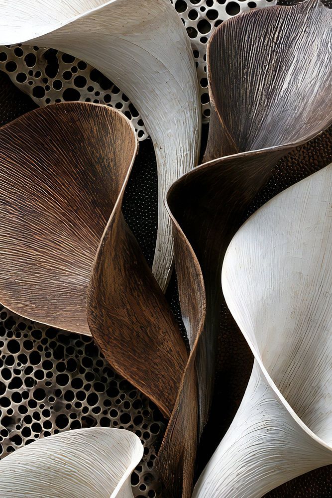 Abstract still life with flowers in off-white and brown tones with a coarse stone and wood texture.
